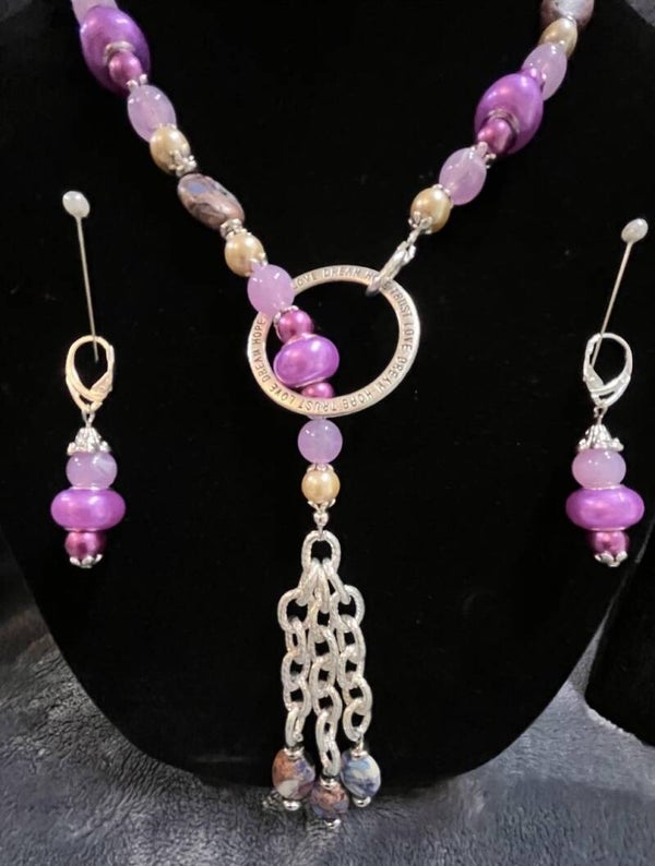 Loop Lavender Pearls Jewelry Set: 27" necklace with no clasp as it loops into itself, 7.5"-8.5" bracelet, and 2" earrings. Made of amethyst/agate/tourmaline/jades/European beads, antique silver caps, spacers, and findings.