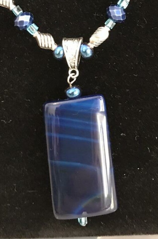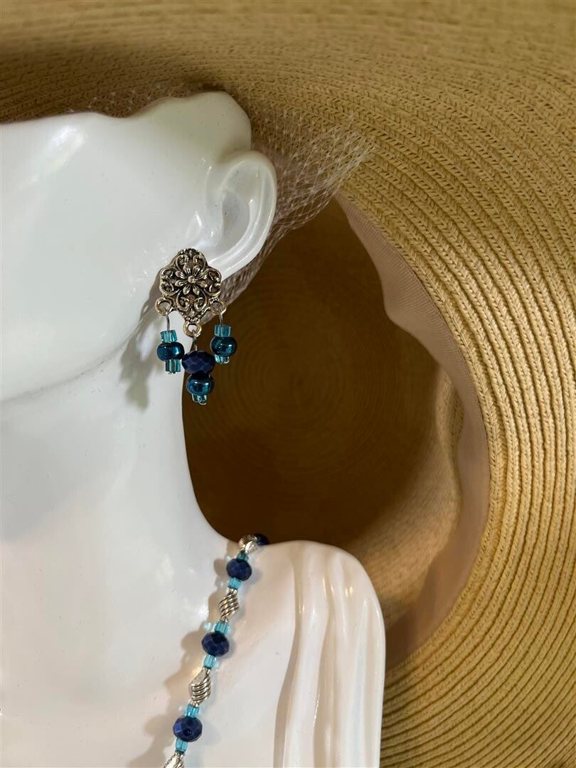 Barble Navy Rectangle Jewelry Set: 25"-27" necklace, 2.5" pendant, 6.3" bracelet, 7.1" bracelet, and 1.5" earrings.Made of light blue and navy blue glass pearls, white silver caps, spacers, findings.