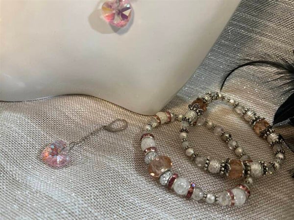 Pink Hearts Jewelry Set. 20" necklace with a 2" pink faceted crystal heart pendant, 6.3" bracelet, 6.5" bracelet, and 2" earrings. Make mostly of light white cracked glass beads, pink faceted glass hearts. Silver caps, findings.
