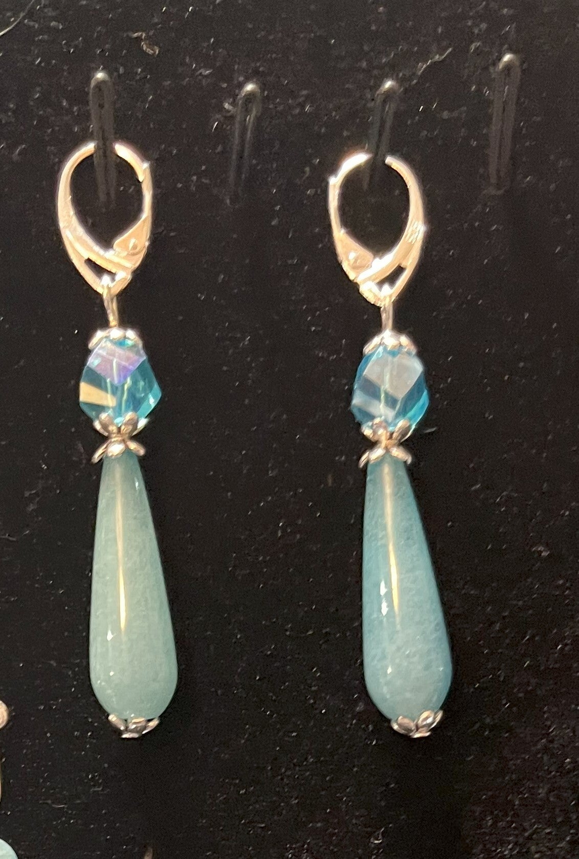 Blue Aquamarine Teardrop Pendant Necklace Set: comes with a 20" necklace with a 3.7" pendant, 6.7" bracelet, and 2.5" earrings. Made with aquamarine teardrop stones, aquamarine round stones, aqua blue glass pearls, and white silver-plated connectors, clasp, chain, spacers, caps, and findings.