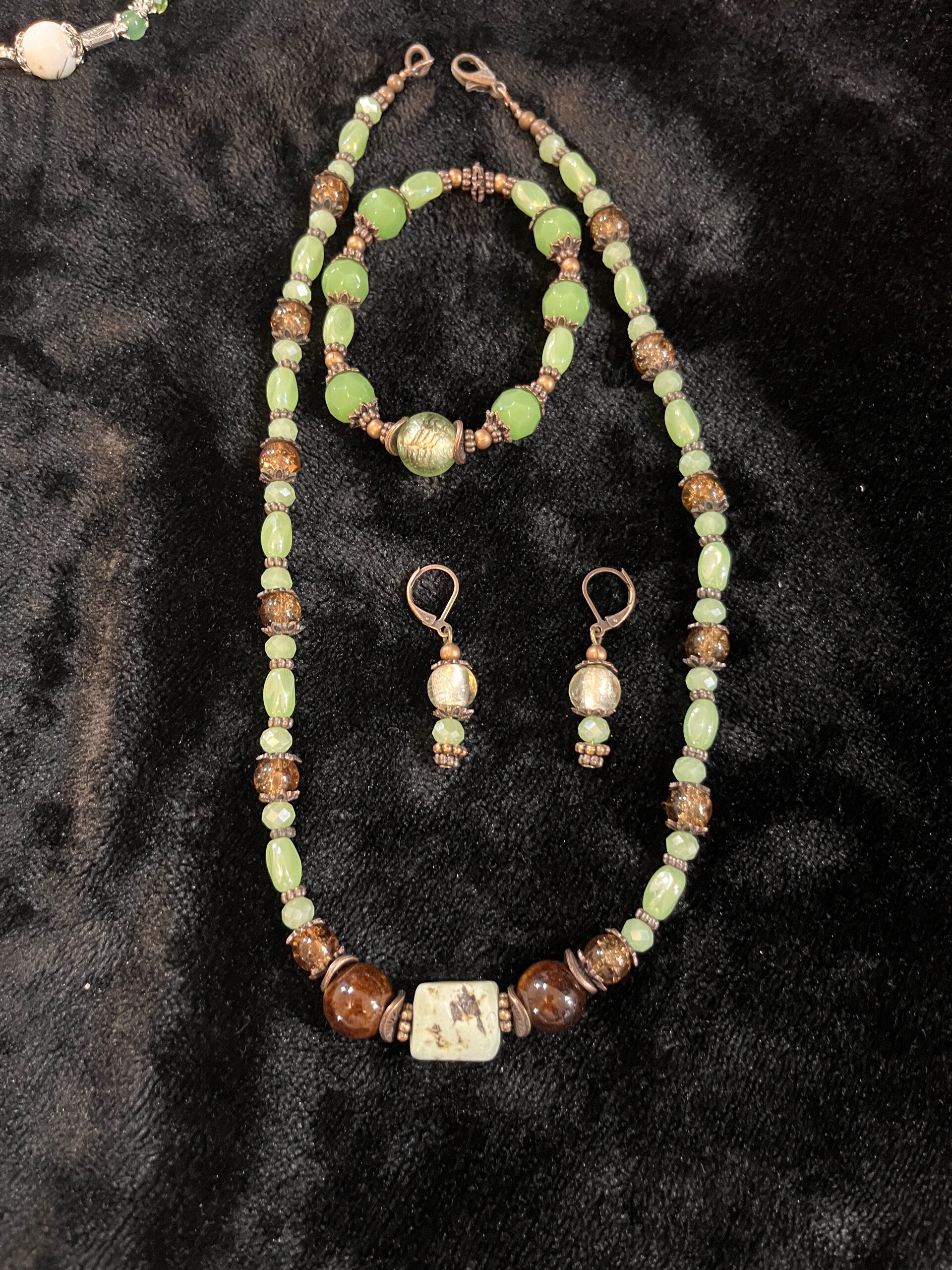 Mint Green Asymmetric Square Necklace Set: comes with a 19" necklace, 6.5" bracelet, and 1.7" earrings. Made of ceramic and faceted glass pearls, round and oval, and foiled green/brown glass beads, crackled brown glass beads; copper clasp, caps, spacers, and findings.