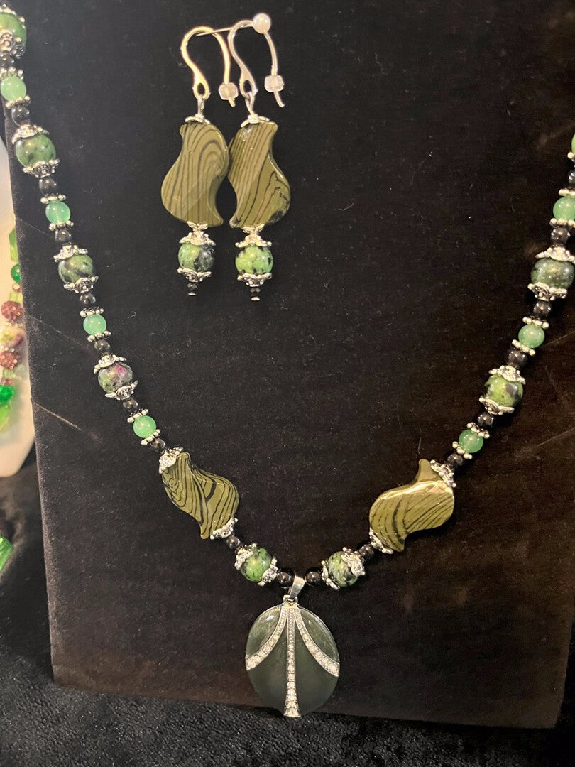 Field of Olive Necklace Set: 21.5" neckalce with a 2" pendant, 6" bracelet, and 2.7" earrings. Made of Green with black Line Agates, smaller Taiwan jades gems. Silver color metal for caps, bails, claps, and findings. Note: the color of pendant and wave connectors are the same olive green that shows differently in pictures.