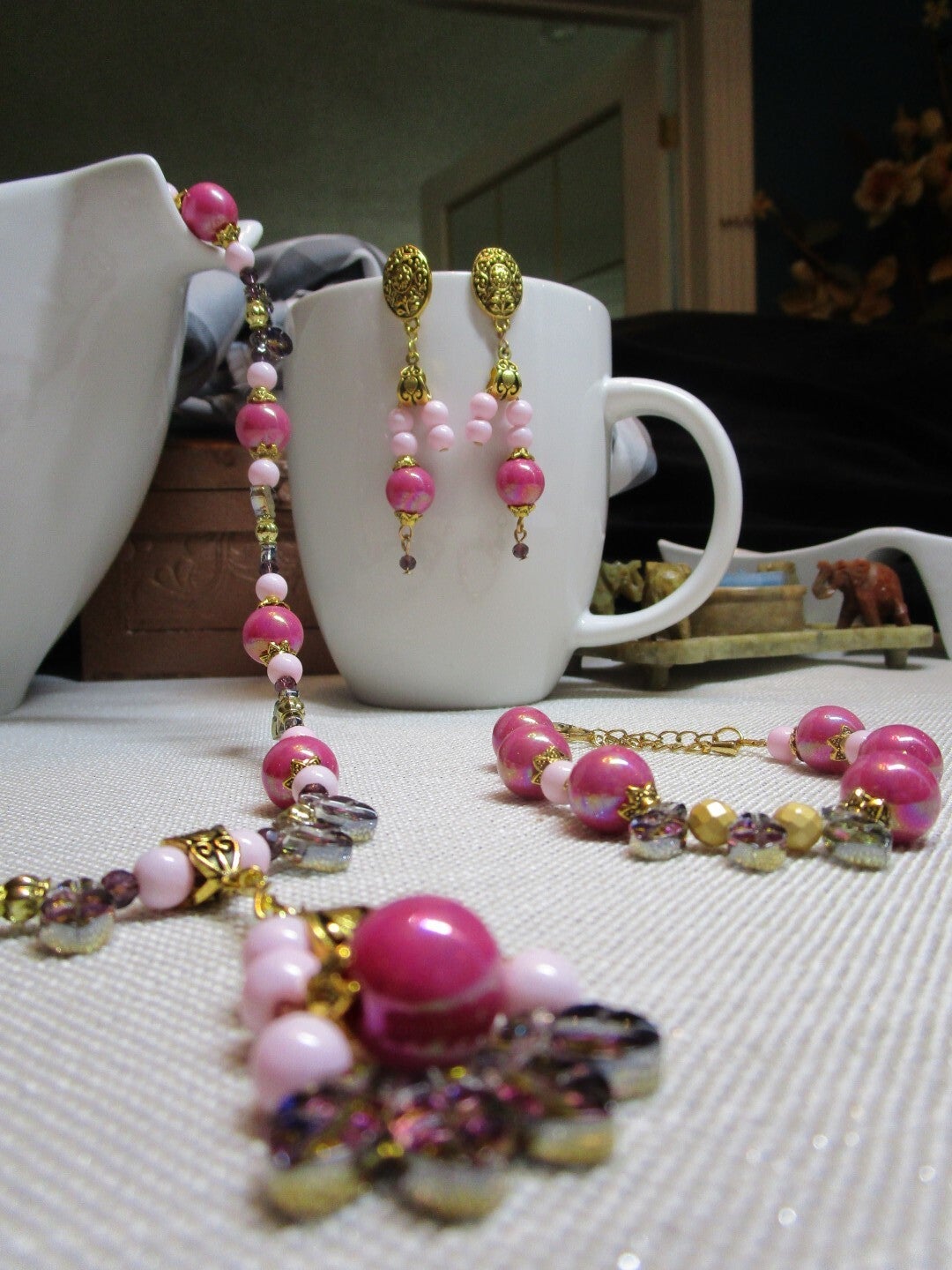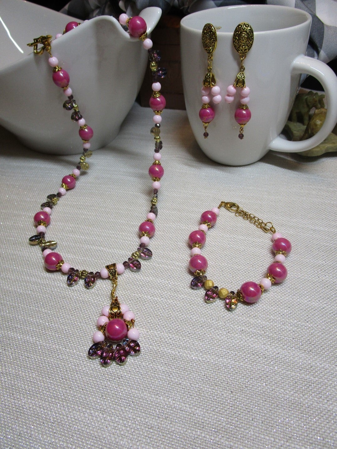 Rasberry Pink Necklace Set: comes with a 21" necklace, a 7.5"-9" bracelet, and 2.5" earrings. Made of rasberry pink, light pink and black glass pearls, and purple drops. Gold plated caps, bail, and findings.