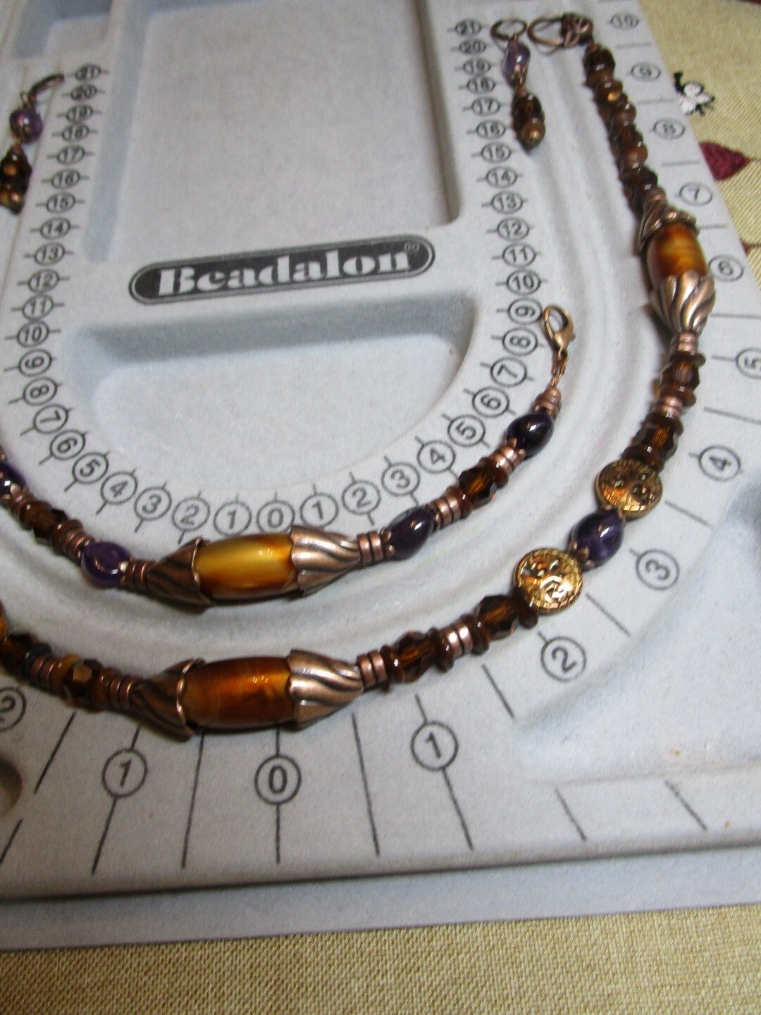 Copper Tiger Tubes and Purple Necklace Set: comes with a 20" necklace, a 7.25"-7.8" braceket, 2.25" earrings. Made of Tiger tubular beads, purple and brown glass pearls, copper caps, spacers, and findings.