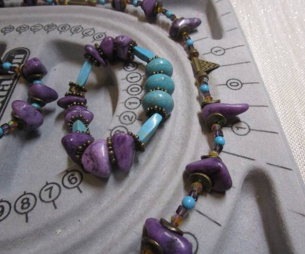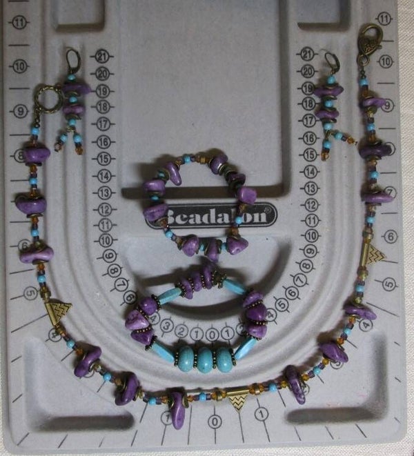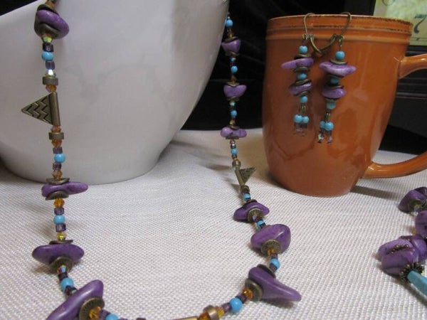 Chipped Purple Amethyst Stones Necklace Set comes with a 20" necklace, two 6.3" bracelets, 2.5" earrrings. Made of chipped amethyst stones, howlite turquoises beads and tubes, small amber faceted bicones; with broze caps, spaces, findings.