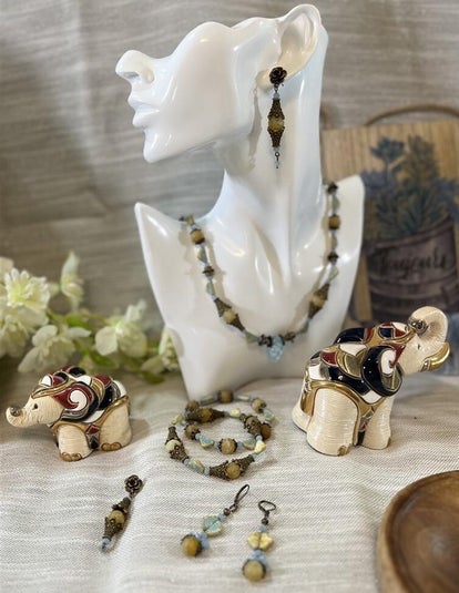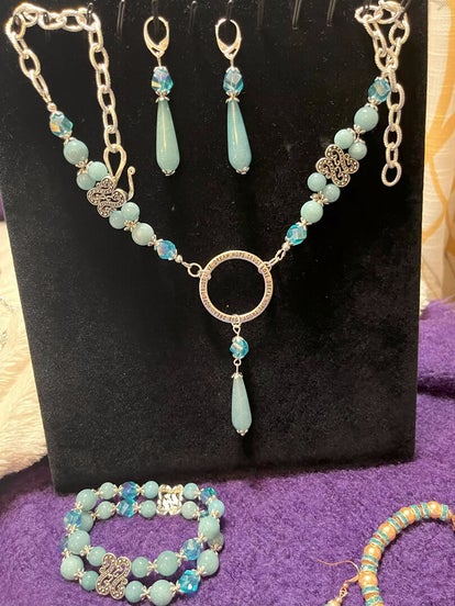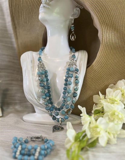 Three-Row Blue Amazonite Jewelry Set comes with 20"-22" necklace with a 1.5" winged-heart (A piece of my Heart has Wings), 6.5"-7" bracelet and 2.5" earrings. Beautiful 3-row bracelet and bird earrings accomponie this necklace. Antique and white silver caps, spacers and finding.s