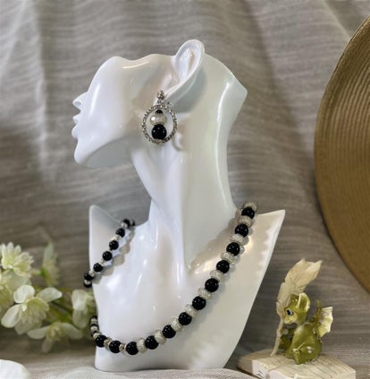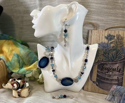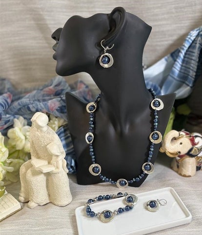 Navy and Baby Blue Necklace Set comes with a 19" necklace, 6" bracelet and 2" earrings. Beautiful large center pearl, with antique silver accents, aqua blue crystals, black beads. Antique silver spacers, accents and findings.