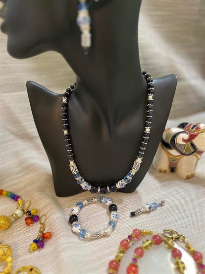 Peakcock Blue, Black and Baby Blue Necklace Set comes with 19" necklace, 6" bracelet and 2" earrings. Made of Peacock teal blue glass beads, baby blue and black glass beads. Silver accents and findings.