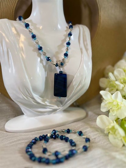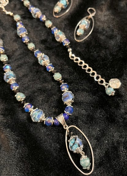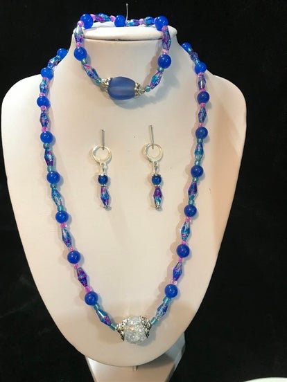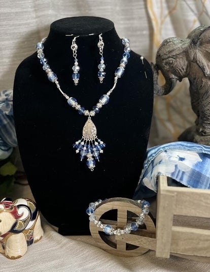 Transparent Royal Blue Silver Wrapped Teardrop Necklace Set comes with 20.75" necklace, 1.5" silver wire-wrapped blue pendant, 7.5" bracelet, and 2.5" earrings. All made of glass beads of various sizes of royal blue, aqua blue and silver. Silver acents, spacers and findings.
