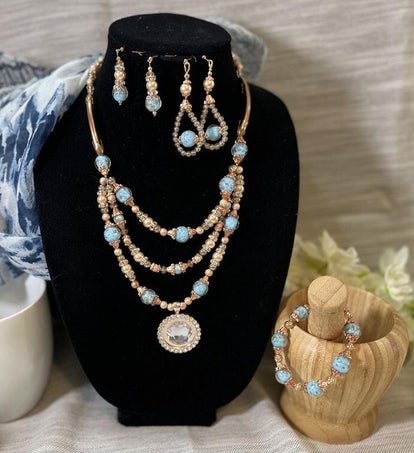 Three-row Rose Gold Large Round Pendant Necklace Set comes with 19.8" necklace with additional 4" rows, 1.5" pendant surrounded with clear rhinestones, 6.45" bracelet and two sets of earrings: one at 2" and the second at 3" long. Rare find. Made of 3-row of rose gold glass and pearls and speck of gold on Baby blue glass beads. Toggle Clasp. Rose Gold tubes. Rose Gold accents, caps, spacer, findings.