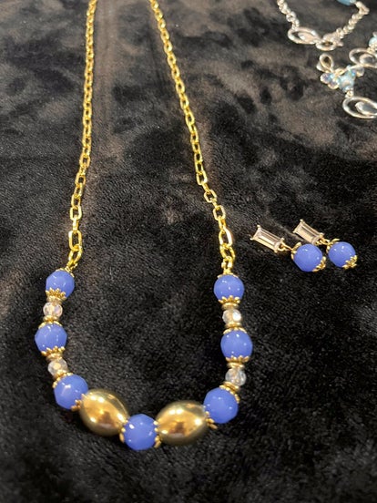 Cornflower Necklace and Earrings Set: comes with a 29" necklace and 1" earrings. Made of faceted cornflower blue beads, oval gold-plated tubes, gold-plated caps, chain, claps, and findings.