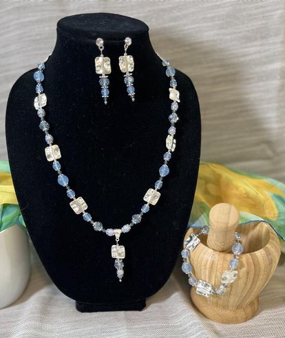 Blue and Silver Lampwork Glass Neckace Set comes with 18" necklace, 3" pendant, 7.5" bracelet and 3" earrings. Made of ligth blue and silver lampwork glass beads, faceted flat rounded deeper blue glass beads (with a hint of lavender blue) and the lightest blue faceted glass beads. Tibetan tubes, spacers, caps, findings. Toggle Clasp.